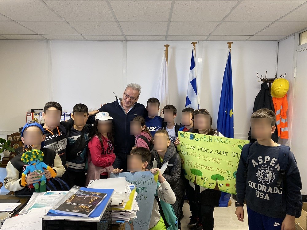 Μια, εκτός προγράμματος, ευχάριστη επίσκεψη είχε ο Δήμαρχος Ηρακλείου Αλέξης Καλοκαιρινός από τους μαθητές της Δ’ και Ε’ τάξης του 46ου Δημοτικού Σχολείου Ηρακλείου το οποίο συμμετέχει στο πρόγραμμα Erasmus της Ευρωπαϊκής Ένωσης με τίτλο «Σώζουμε τη γη».