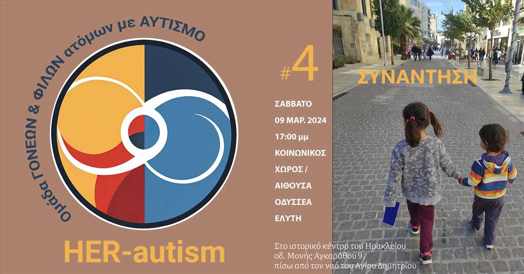 Η τέταρτη συνάντηση της εθελοντικής Ομάδας Γονέων και Φίλων Ατόμων με Αυτισμό είναι προγραμματισμένη να γίνει το Σάββατο 9 Μαρτίου 2024, ώρα 17:00, πάλι, στον Κοινωνικό Χώρο των Ιδρυμάτων Α. και Μ. Καλοκαιρινού (αίθουσα ΟΔΥΣΣΕΑ ΕΛΥΤΗ, οδ. Μονής Αγκαράθου 9). Μαζί μας θα είναι η Πρόεδρος του Δ.Σ. του Συλλόγου Ηρακλείου «Ροδαυγή» για τη νοητική αναπηρία, κυρία Γιούλα Λιαπάκη, η οποία μόλις βραβεύτηκε για το σύνολο της τριακονταετούς προσφοράς της στους συνανθρώπους μας με αόρατες αναπηρίες (Woman’s Awards 2024, 4/3/24, Πολιτιστικό και Συνεδριακό Κέντρο Ηρακλείου). Η επιχειρηματίας Τζίνα Τσαντρίζου, ενεργό μέλος της ομάδας HER-autism, απένειμε το βραβείο στην κυρία Λιαπάκη, υπό το θερμό χειροκρότημα του κοινού στην κατάμεστη κύρια Αίθουσα Ανδρέα και Μαρίας Καλοκαιρινού του ΠΣΚΗ.