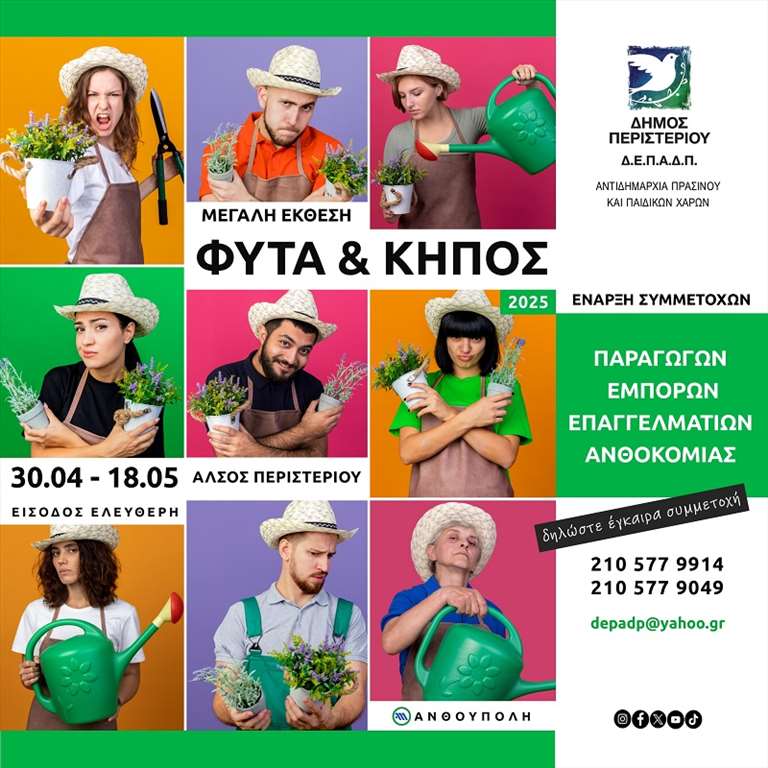 Ο Δήμος Περιστερίου διοργανώνει τη μεγάλη ετήσια Έκθεση «Φυτά & Κήπος», στο ομορφότερο Άλσος της Αττικής – το Άλσος Περιστερίου, κοντά στη στάση Μετρό «Ανθούπολη» – από τις 30 Απριλίου έως τις 18 Μαΐου 2025, με είσοδο ελεύθερη για όλους.