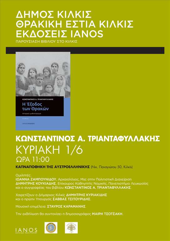 Ο Δήμος Κιλκίς, η Θρακική Εστία Κιλκίς και οι εκδόσεις Ιανός παρουσιάζουν την ερχόμενη Κυριακή 1η Ιουνίου στις 11:00 στην Καπναποθήκη της Αυστροελληνικής το ιστορικό μυθιστόρημα του Κωνσταντίνου Α. Τριανταφυλλάκη ‘’Η Έξοδος των Θρακών’’.