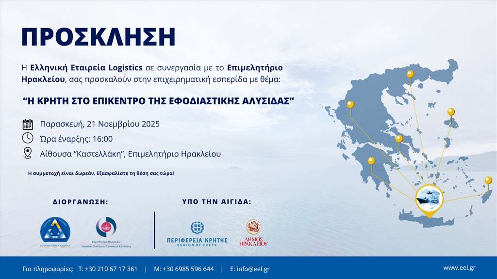 Η Ελληνική Εταιρεία Logistics (EEL), σε συνεργασία με το Επιμελητήριο Ηρακλείου, διοργανώνει επιχειρηματική εσπερίδα με τίτλο: «Η Κρήτη στο Επίκεντρο της Εφοδιαστικής Αλυσίδας» την Παρασκευή 21 Νοεμβρίου 2025, στις 16:00, στην αίθουσα «Καστελλάκη» του Επιμελητηρίου Ηρακλείου (Κορωναίου 9).
