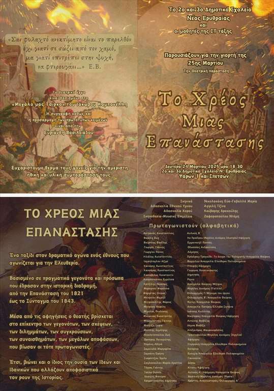 Το 2ο & 3ο Δημοτικό Σχολείο Νέας Ερυθραίας, στο πλαίσιο των επετειακών εκδηλώσεων για τον εορτασμό της 25ης Μαρτίου 1821 παρουσιάζουν σήμερα Δευτέρα 24 Μαρτίου στις 6: 30μμ, στη Θεατρική σκηνή 2ου & 3ου Δημοτικού Νέας Ερυθραίας (Ψαρών & Σπετσών 1) την θεατρική παράσταση "Το χρέος μιας Επανάστασης".