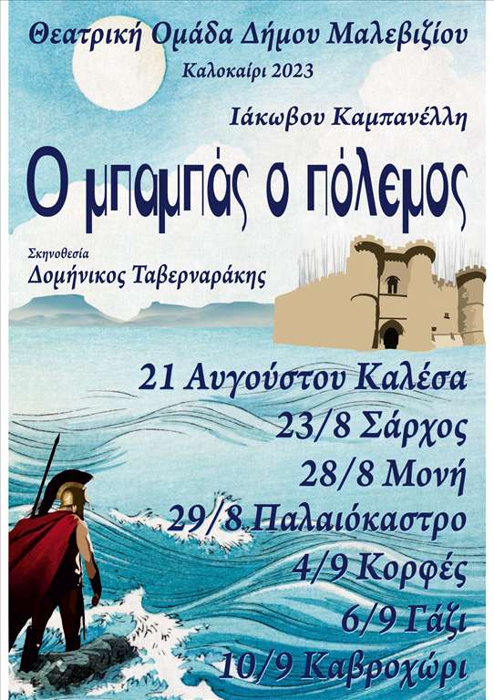Οι επόμενες παραστάσεις της Θεατρικής Ομάδας του Δήμου Μαλεβιζίου είναι προγραμματισμένες στις 28 στη Μονή, την επόμενη μέρα 29 Αυγούστου στο Παλιόκαστρο, στις 4 Σεπτεμβρίου στις Κορφές, στις 6 Σεπτεμβρίου στο Γάζι και στις 10 Σεπτεμβρίου στο Καβροχώρι.
