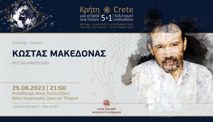 Με την συναυλία του γνωστού μουσικού Κώστα Μακεδόνα ξεκινά την Παρασκευή 25 Αυγούστου το Φεστιβάλ του Δήμου Ηρακλείου «Κρήτη μια Ιστορία, 5+1 Πολιτισμοί», που διοργανώνεται για 9η συνεχή χρονιά. Ο Κώστας Μακεδόνας, από τους σημαντικότερους ερμηνευτές της γενιάς του, δεν χρειάζεται ιδιαίτερες συστάσεις, ούτε άλλωστε οι μουσικοί που τον συνοδεύουν.