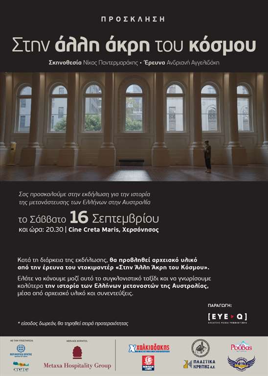 Το Σάββατο 16 Σεπτεμβρίου και ώρα 20:30 στο Cine “Creta Maris” στο Λιμάνι Χερσονήσου, θα πραγματοποιηθεί εκδήλωση για την ιστορία της μετανάστευσης των Ελλήνων στην Αυστραλία, με αφορμή το ντοκιμαντέρ «Στην άλλη άκρη του κόσμου».