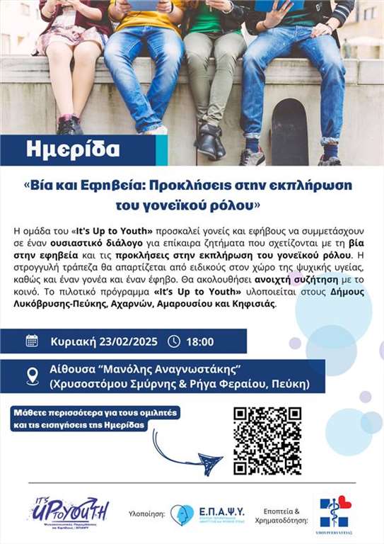 Ημερίδα με τίτλο «Βία και Εφηβεία: Προκλήσεις στην εκπλήρωση του γονεϊκού ρόλου» πραγματοποιείται την Κυριακή 23 Φεβρουαρίου στις 18.00 στην Αίθουσα "Μανόλης Αναγνωστάκης" στο Δημοτικό Θέατρο Πεύκης, (Χρυσοστόμου Σμύρνης & Ρήγα Φεραίου, Πεύκη).