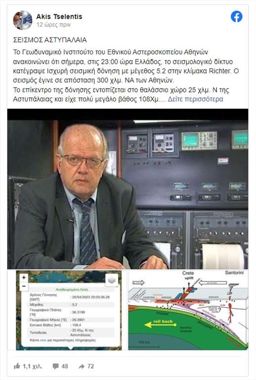 Καθησυχαστικοί για τις ενδεχόμενες συνέπειες από τον σεισμό των 5,2 Ρίχτερ που σημειώθηκε το βράδυ της Τετάρτης με επίκεντρο τον θαλάσσιο χώρο νότια της Αστυπάλαιας εμφανίστηκαν με αναρτήσεις τους στο Facebook οι σεισμολόγοι Άκης Τσελέντης και Γεράσιμος Παπαδόπουλος.