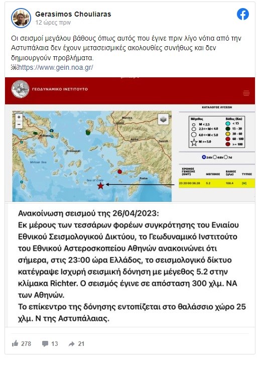 Υπενθυμίζεται ότι το βράδυ της Τετάρτης 26/4 ο σεισμολόγος Γεράσιμος Χουλιάρας μέσω ανάρτησης του στο Facebook έγραψε: «Οι σεισμοί μεγάλου βάθους όπως αυτός που έγινε πριν λίγο νότια από την Αστυπάλαια δεν έχουν μετασεισμικές ακολουθίες συνήθως και δεν δημιουργούν προβλήματα».
