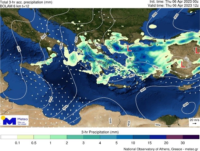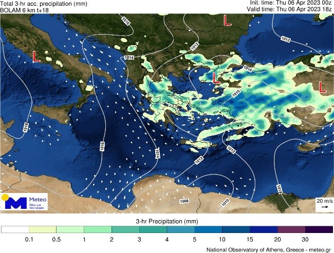 Σύμφωνα με τα προγνωστικά στοιχεία του Εθνικού Αστεροσκοπείου Αθηνών/ meteo.gr, οι βροχές και οι καταιγίδες που εκδηλώνονται κατά τόπους τις πρωινές ώρες της Πέμπτης 06/04 αναμένεται κατά τη διάρκεια της ημέρας να επηρεάσουν τις περισσότερες περιοχές της χώρας και την Κρήτη.