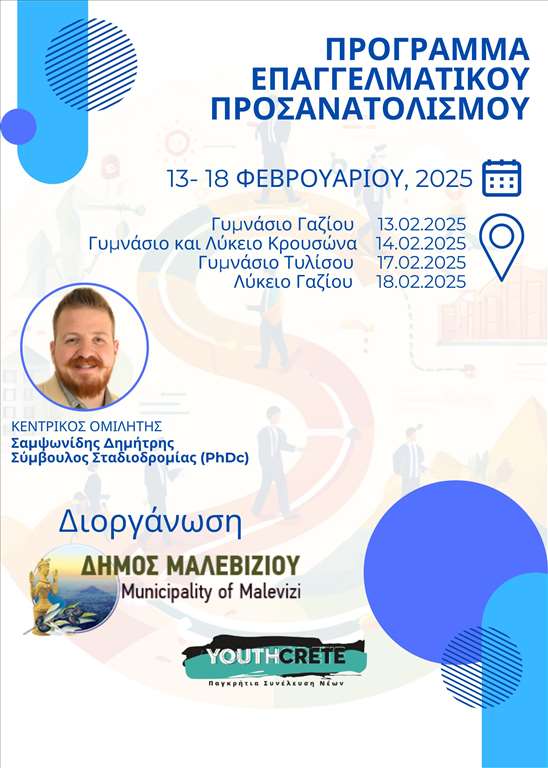 Ο Δήμος Μαλεβιζίου, σε συνεργασία με το Youth Crete, μια πρωτοβουλία της Περιφέρειας Κρήτης για τους νέους, διοργανώνει Πρόγραμμα Επαγγελματικού Προσανατολισμού για τους μαθητές Γυμνασίων και Λυκείων της περιοχής.