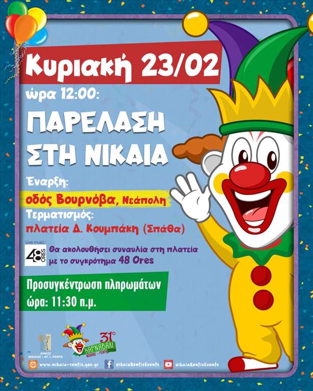 Για πρώτη φορά η μεγάλη Καρναβαλική Παρέλαση στη Νίκαια θα πραγματοποιηθεί στην περιοχή της Νεάπολης και συγκεκριμένα στην οδό Βουρνόβα, την Κυριακή 23 Φεβρουαρίου στις 12.00 μ.μ. Η παρέλαση θα καταλήξει στην πλατεία Διαμάντως Κουμπάκη (Σπάθα) και θα ακολουθήσει συναυλία στις 13.30 με το συγκρότημα 48 Ores.