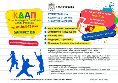 Οι εγγραφές στο ΚΔΑΠ του Δήμου Βριλησσίων θα ξεκινήσουν στις 8 Σεπτεμβρίου 2025 και θα υπάρξει νεότερη ενημέρωση για τον χρόνο υποβολής των αιτήσεων εγγραφής.