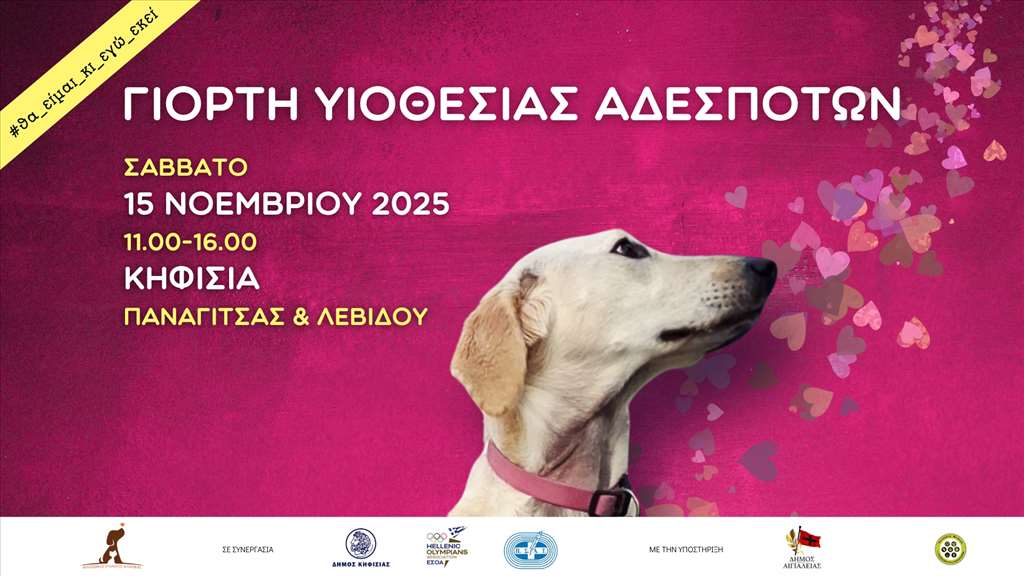 Με ιδιαίτερη χαρά σας προσκαλούμε το Σάββατο 15 Νοεμβρίου 2025, από τις 11:00 π.μ. – 4:00 μ.μ. στο κέντρο της Κηφισιάς, στη συμβολή των οδών Παναγίτσας και Λεβίδου, σε μια μεγάλη γιορτή υιοθεσίας αδέσποτων ζώων, που πραγματοποιείται σε συνεργασία με το Φιλοζωικό Σύλλογο Αιγιαλείας.