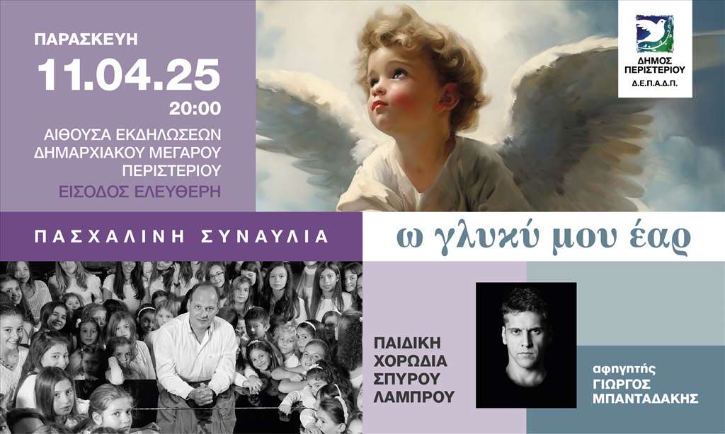 Ο Δήμαρχος Περιστερίου Ανδρέας Π. Παχατουρίδης, με ιδιαίτερη συγκίνηση και χαρά, σας προσκαλεί στη μεγάλη Πασχαλινή Χορωδιακή Συναυλία, την Παρασκευή 11 Απριλίου 2025 και ώρα 20.00, στο αμφιθέατρο του Δημαρχιακού Μεγάρου – στάση Μετρό «Περιστέρι». Η είσοδος είναι ελεύθερη!