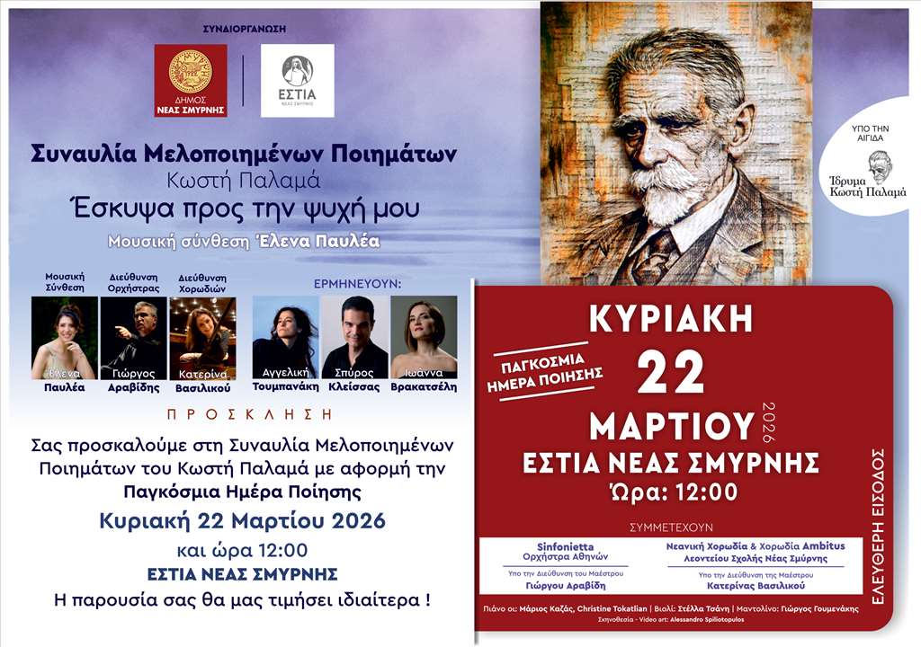 «Έσκυψα προς την ψυχή μου» είναι ο τίτλος της συναυλίας αφιερωμένης στον ποιητικό λόγο του Κωστή Παλαμά που θα πραγματοποιηθεί την Κυριακή 22 Μαρτίου, ώρα 12:00 στην Εστία Νέας Σμύρνης. Πρόκειται για μια πρωτοβουλία του Δήμου Νέας Σμύρνης, που διοργανώνεται από κοινού με την Εστία Νέας Σμύρνης, με αφορμή την Παγκόσμια Ημέρα Ποίησης, υπό την αιγίδα του Ιδρύματος Παλαμά, με ΕΛΕΥΘΕΡΗ ΕΙΣΟΔΟ.