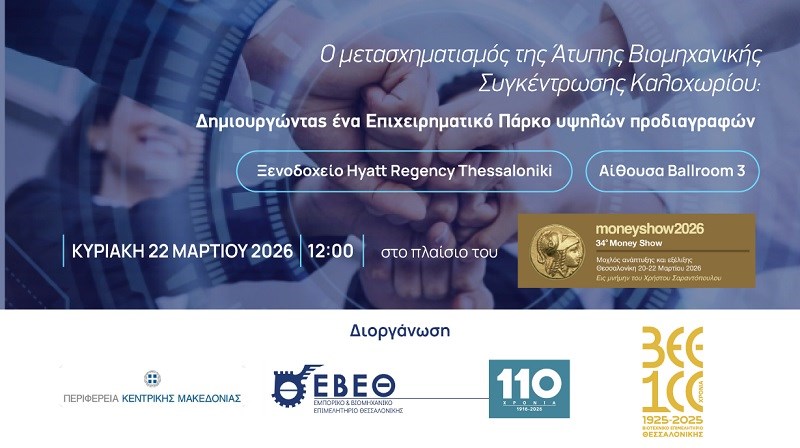 Η Περιφέρεια Κεντρικής Μακεδονίας (ΠΚΜ), το Εμπορικό και Βιομηχανικό Επιμελητήριο Θεσσαλονίκης (ΕΒΕΘ) και το Βιοτεχνικό Επιμελητήριο Θεσσαλονίκης (ΒΕΘ) συνδιοργανώνουν ειδική ενημερωτική εκδήλωση με θέμα: «Ο μετασχηματισμός της Άτυπης Βιομηχανικής Συγκέντρωσης Καλοχωρίου: Δημιουργώντας ένα Επιχειρηματικό Πάρκο υψηλών προδιαγραφών».
