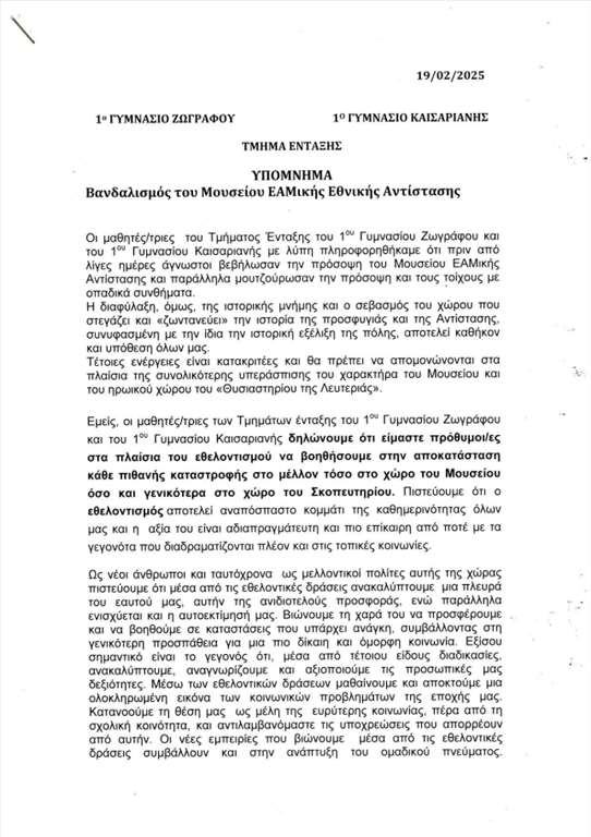 Κατά την πρόσφατη επίσκεψή τους στο Μουσείο ΕΑΜικής Αντίστασης, οι μαθητές και οι μαθήτριες , κατέθεσαν υπόμνημα με το οποίο καταδικάζουν την πρόσφατη ενέργεια βανδαλισμού στην πρόσοψη του κτιρίου, ενώ δηλώνουν την ετοιμότητά τους να βοηθήσουν στην αποκατάσταση κάθε πιθανής καταστροφής στο μέλλον αλλά και στην ολοκλήρωση κάθε έργου βελτίωσης των υποδομών του Σκοπευτηρίου.