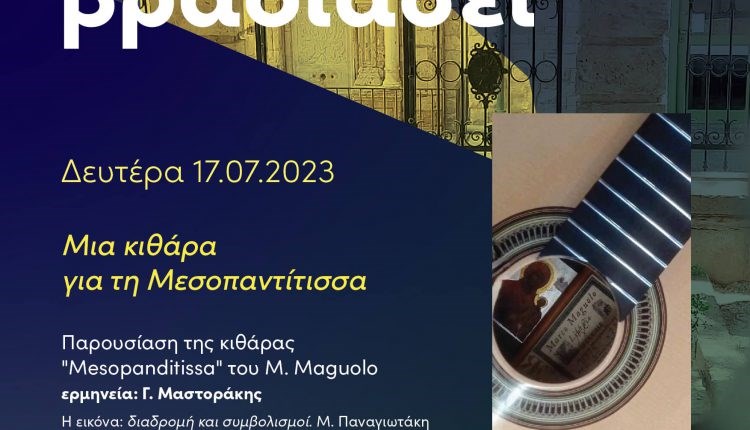 Ο φετινός κύκλος εκδηλώσεων Άμα Βραδιάσει ξεκινάει με μια ιδιαίτερη για το Ηράκλειο μουσική βραδιά, τη Δευτέρα 17 Ιουλίου, ώρα 20.30 στον Κήπο του Ιστορικού Μουσείου Κρήτης. Ο σολίστας Γιώργος Μαστοράκης και η φιλόλογος-ιστορικός Μάρα Παναγιωτάκη παρουσιάζουν την κιθάρα Mesopanditissa του Marco Maguolo.