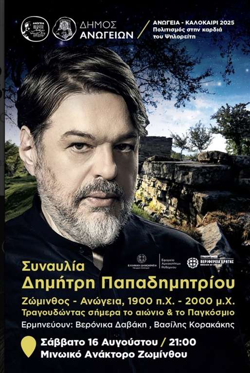 Ο συνθέτης Δημήτρης Παπαδημητρίου, με έργο που έχει ταξιδέψει σε μεγάλες διεθνείς σκηνές και έχει τιμήσει στιγμές όπως οι Ολυμπιακοί Αγώνες, θα οδηγήσει το κοινό σε ένα μουσικό ταξίδι εμπνευσμένο από τον Μινωικό Πολιτισμό και την ακατάλυτη αξία της πολιτιστικής μας κληρονομιάς.