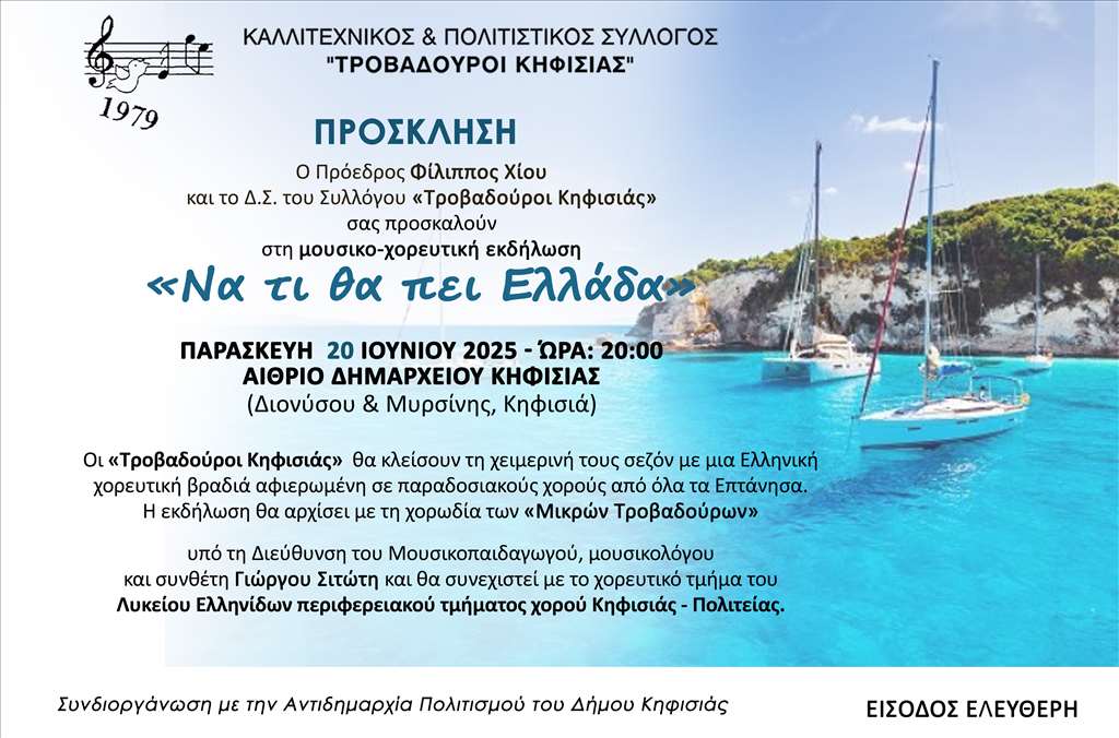 Ο Πρόεδρος Φίλιππος Χίου και το Δ.Σ. του Συλλόγου «Τροβαδούροι Κηφισιάς» σας προσκαλούν στη μουσικο-χορευτική εκδήλωση «Να τι θα πει Ελλάδα», που θα πραγματοποιηθεί την Παρασκεύη 20 Ιουνiου 2025 , στις 20:00 στο Αiθριο του Δημαρχεiου Κηφισιάς (Διονύσου & Μυρσίνης, Κηφισιά) με ελεύθερη είσοδο για το κοινό.