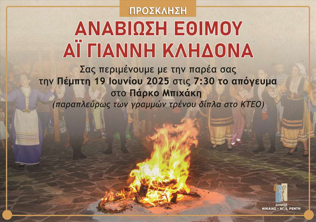Ο Δήμος Νίκαιας – Αγ. Ι. Ρέντη, σε συνεργασία με τη Διεύθυνση Αθλητισμού και τη Διεύθυνση Κοινωνικής Προστασίας , Ισότητας και Τρίτης Ηλικίας, διοργανώνει τιμά την παράδοση με δύο ξεχωριστές εκδηλώσεις για τον Κλήδονα και τις φωτιές του Αϊ-Γιάννη. Οι εκδηλώσεις περιλαμβάνουν δρώμενα, χορούς και έθιμα που φέρνουν κοντά μικρούς και μεγάλους, διατηρώντας ζωντανή την πολιτιστική μας κληρονομιά.