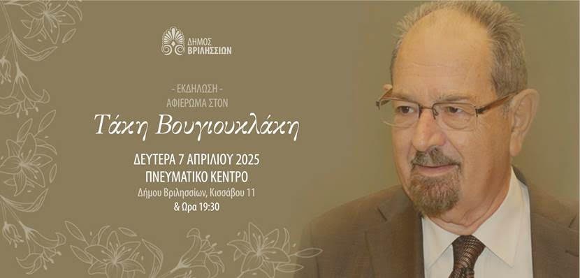 Τέσσερα χρόνια συμπληρώνονται από την απώλεια του Τάκη Βουγιουκλάκη και ο Δήμος Βριλησσίων, η πόλη που έζησε και υπηρέτησε, διοργανώνει μια εκδήλωση αφιερωμένη στη μνήμη και το πολυσχιδές έργο του, στον πολιτισμό και στην αυτοδιοίκηση.