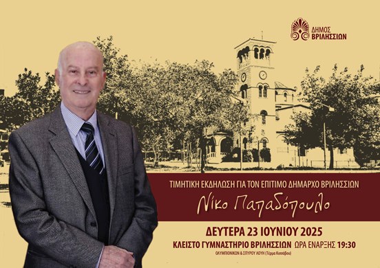 Ο Δήμος Βριλησσίων τιμά τον Επίτιμο Δήμαρχο Νίκο Παπαδόπουλο με μια εκδήλωση που θα πραγματοποιηθεί τη Δευτέρα 23 Ιουνίου 2025 και ώρα 19:30 στο Κλειστό Γυμναστήριο της πόλης μας στη συμβολή των οδών Ολυμπιονικών και Σπύρου Λούη (τέρμα Κισσάβου)