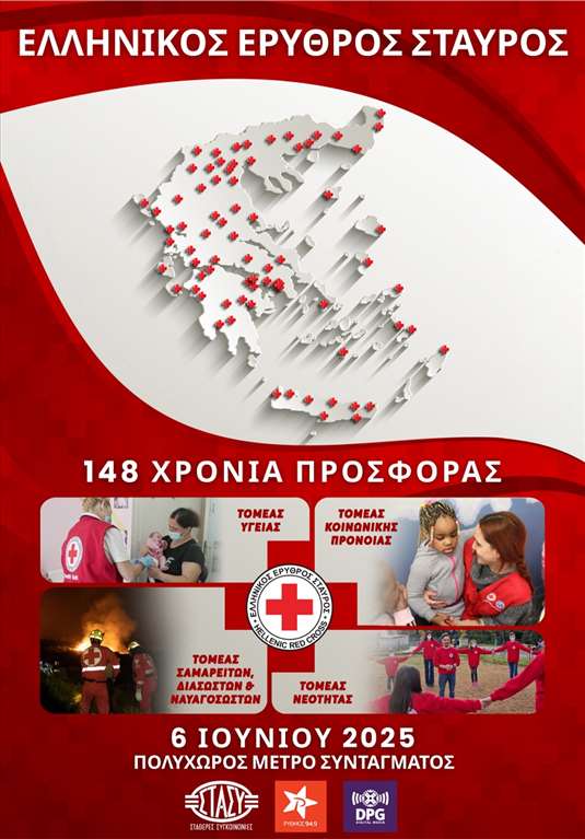 O Ελληνικός Ερυθρός Σταυρός, με αφορμή τη συμπλήρωση 148 ετών από την ίδρυσή του (10 Ιουνίου), θα πραγματοποιήσει την Παρασκευή 6 Ιουνίου 2025, και ώρες 09:00 – 21:00, μεγάλη εκδήλωση-έκθεση για μικρούς και μεγάλους, με τίτλο «Ελληνικός Ερυθρός Σταυρός – 148 χρόνια προσφοράς», στον Πολυχώρο Εκδηλώσεων του Μετρό Συντάγματος.