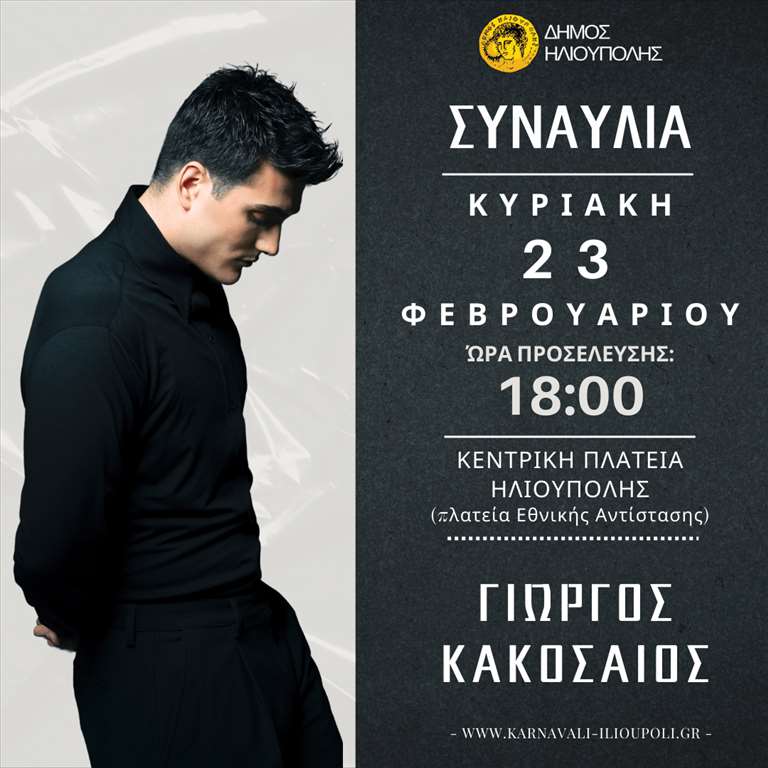 Μετά την Καρναβαλική παρέλαση θα ακολουθήσει Συναυλία με ώρα προσέλευσης 18:00 μ.μ. με τον Γιώργο Κακοσαίο, ο οποίος θα ταξιδέψει τον κόσμο με τις μουσικές του στην κεντρική πλατεία Ηλιούπολης (πλατεία Εθνικής Αντίστασης).
