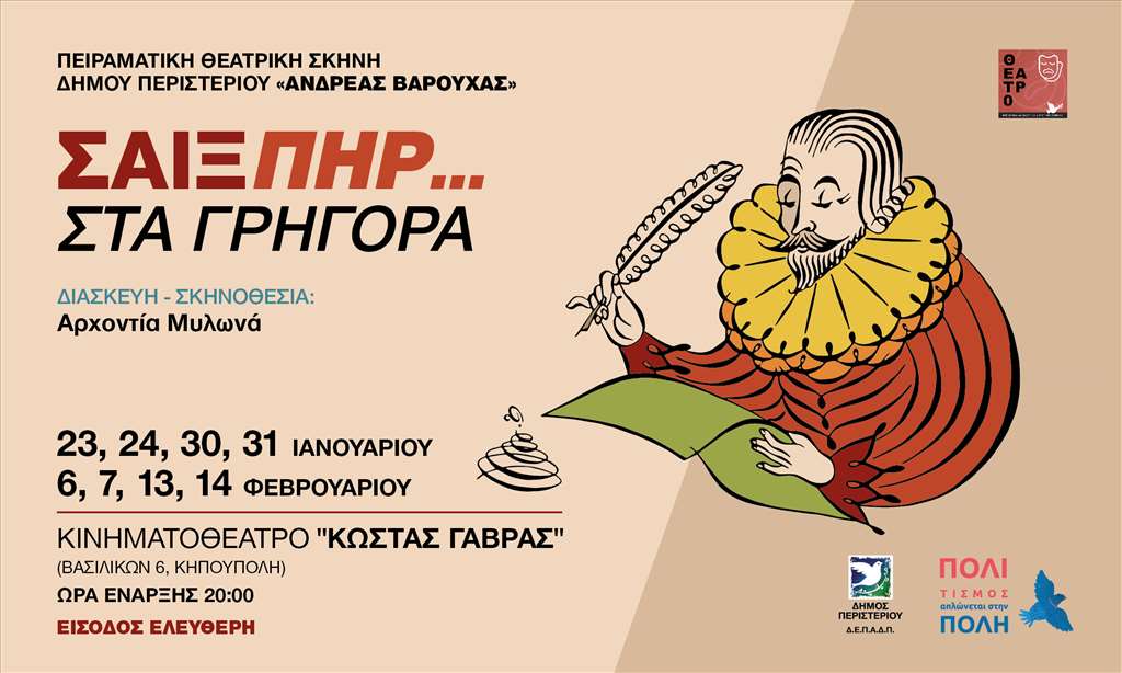 Ο Δήμαρχος Περιστερίου, Ανδρέας Π. Παχατουρίδης, προσκαλεί τους πολίτες στη θεατρική παράσταση «Σαίξπηρ… στα γρήγορα», που παρουσιάζει η Πειραματική