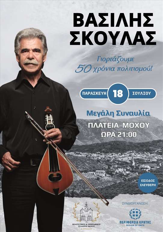 Ο Πολιτιστικός και Λαογραφικός Σύλλογος Μοχού “Η ΠΡΟΟΔΟΣ”, σε συνδιοργάνωση με την Περιφέρεια Κρήτης, παρουσιάζει μια μοναδική συναυλία με τον σπουδαίο Κρητικό ερμηνευτή και λυράρη Βασίλη Σκουλά, την Παρασκευή 18 Ιουλίου 2025, στις 21:00, στην κεντρική πλατεία του Μοχού.