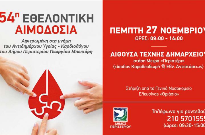 Ο Δήμος Περιστερίου διοργανώνει την 54η Εθελοντική Αιμοδοσία, την Πέμπτη 27 Νοεμβρίου 2025, ώρες 09:00…