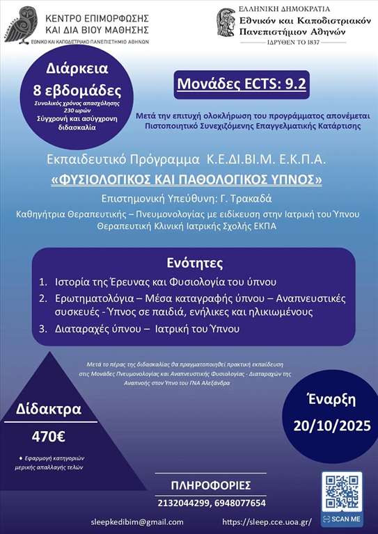 Το πρόγραμμα έχει τίτλο «Φυσιολογικός και Παθολογικός Ύπνος» και θα αρχίσει στις 20 Οκτωβρίου 2025. Επιστημονικά υπεύθυνη είναι η καθηγήτρια Θεραπευτικής-Πνευμονολογίας, με εξειδίκευση στην Ιατρική του Ύπνου, κα Γεωργία Τρακαδά. Το πρόγραμμα απευθύνεται σε: