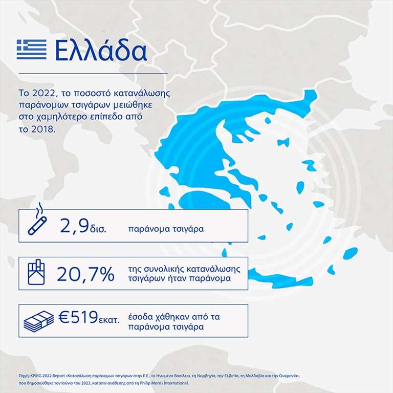 Το 2022 το ποσοστό κατανάλωσης παράνομων τσιγάρων στην Ελλάδα έφτασε στο χαμηλότερο επίπεδο από το 2018, σύμφωνα με τα αποτελέσματα της ετήσιας ανεξάρτητης Έκθεσης της KPMG, που διενεργήθηκε για λογαριασμό της Philip Morris International. Ο όγκος των παράνομων τσιγάρων μειώθηκε κατά 500 εκατ. τσιγάρα, παραμένοντας, όμως, ακόμα σε υψηλά επίπεδα.