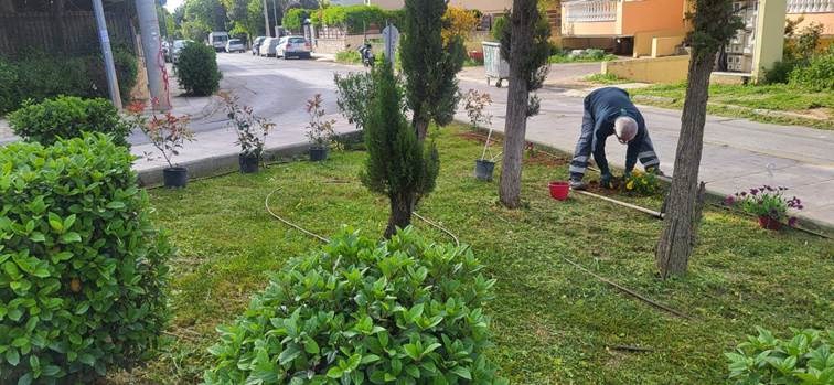 αυτόματο πότισμα και φύτεψαν περιμετρικά της πράσινης νησίδας φωτίνιες και διμορφοθήκες, ομορφαίνοντας τον χώρο.