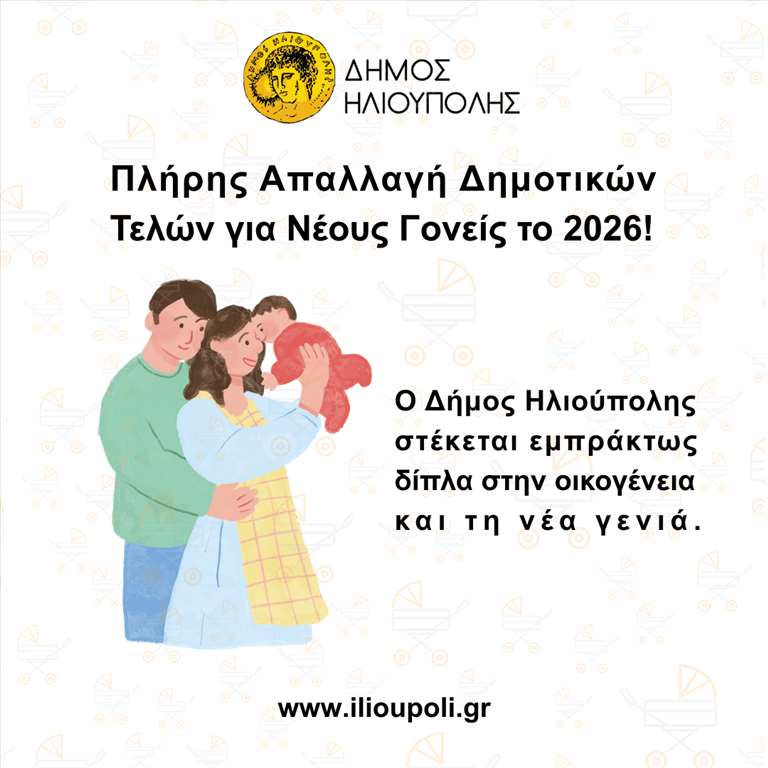 Πλήρη απαλλαγή με ετήσιο εισόδημα μέχρι 20.000 ευρώ και μείωση 50% για μεγαλύτερα εισοδήματα εξασφάλισε ο Δήμος Ηλιούπολης με απόφαση της Δημοτικής Αρχής για νέους γονείς που είναι δημότες και αποκτούν ή έχουν 1 ή και παραπάνω παιδιά μέχρι 3 ετών σύμφωνα με την υπ' αριθμόν 632/2025 απόφαση