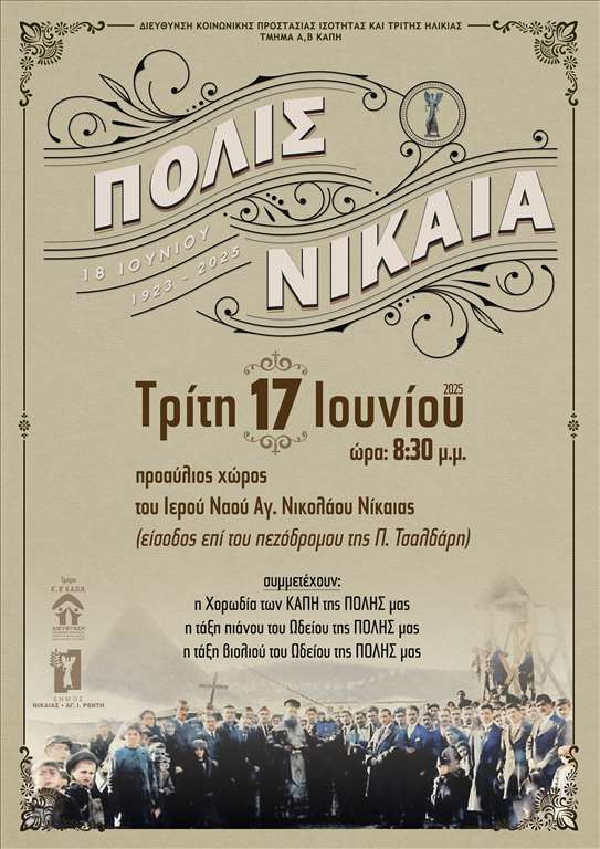 Επετειακή εκδήλωση μνήμης αφιερωμένη στην ημέρα ονοματοδοσίας της Νίκαιας με τίτλο: «ΠΟΛΙΣ ΝΙΚΑΙΑ – 18 Ιουνίου 1923–2025» διοργανώνει η Διεύθυνση Κοινωνικής Προστασίας, Τμήμα Α’, Β’ ΚΑΠΗ Δήμου Νίκαιας-Αγ.Ι. Ρέντη. Η εκδήλωση θα πραγματοποιηθεί την Τρίτη 17 Ιουνίου και ώρα 8:30 μ.μ., στον προαύλιο χώρο του Ιερού Ναού Αγίου Νικολάου Νίκαιας (είσοδος από τον πεζόδρομο της Π. Τσαλδάρη).
