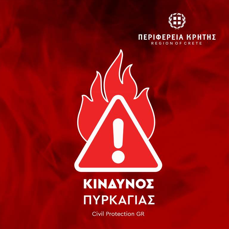 Η Πολιτική Προστασία Περιφέρειας Κρήτης ενημερώνει ότι, σύμφωνα με τον ημερήσιο Χάρτη Πρόβλεψης Κινδύνου Πυρκαγιάς της Γενικής Γραμματείας Πολιτικής Προστασίας,για αύριο Κυριακή 10 Αυγούστου 2025 η κατηγορία Κινδύνου Πυρκαγιάς για όλη την Κρήτη, είναι κατηγορίας κινδύνου 4 (πολύ υψηλός).