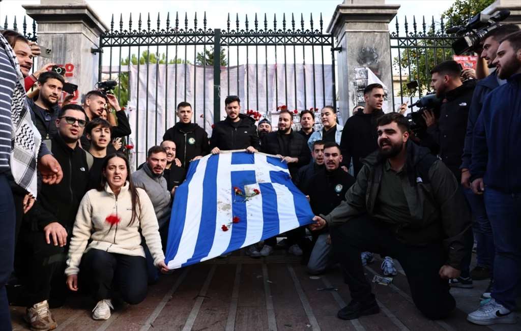 Η σημαία έφτασε μπροστά από την αμερικανική πρεσβεία στις 16:20, όπου οι διαδηλωτές φώναξαν συνθήματα για την επέτειο, κράτησαν ενός λεπτού σιγή για τα θύματα του Πολυτεχνείου και στη συνέχεια έψαλαν τον εθνικό ύμνο, πριν η σημαία καλυφθεί και αποχωρήσει.