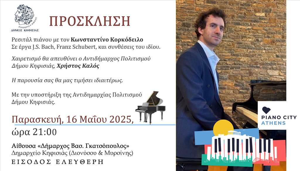 Στο πλαίσιο των φετινών εκδηλώσεων του θεσμού Piano City Athens ο Δήμος Κηφισιάς, φιλοξενεί την Παρασκευή, 16 Μαΐου 2025, ώρα 21:00 στην Αίθουσα «Δήμαρχος Βασ. Γκατσόπουλος» του Δημαρχείου Κηφισιάς (Διονύσου & Μυρσίνης) ένα ξεχωριστό Ρεσιτάλ πιάνου με τον Κωνσταντίνο Κορκόδειλο.