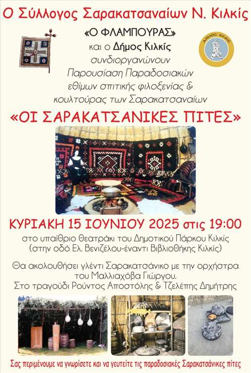Οι σαρακατσάνικες πίτες είναι ένα από τα παραδοσιακά έθιμα της σπιτικής φιλοξενίας και της κουλτούρας των Σαρακατσαναίων, το οποίο θα αναβιώσει την Κυριακή 15 Ιουνίου και ώρα 19:00 στο Μικρό Θέατρο του Δημοτικού Πάρκου – Κήπου από τον Σύλλογο Σαρακατσαναίων ν. Κιλκίς ‘’Ο Φλάμπουρας’’. Θα ακολουθήσει γλέντι σαρακατσάνικο με την ορχήστρα του Γιώργου Μαλλιαχόβα και τη συμμετοχή των τραγουδιστών Αποστόλη Ρούντου και Δημήτρη Τζελέπη.