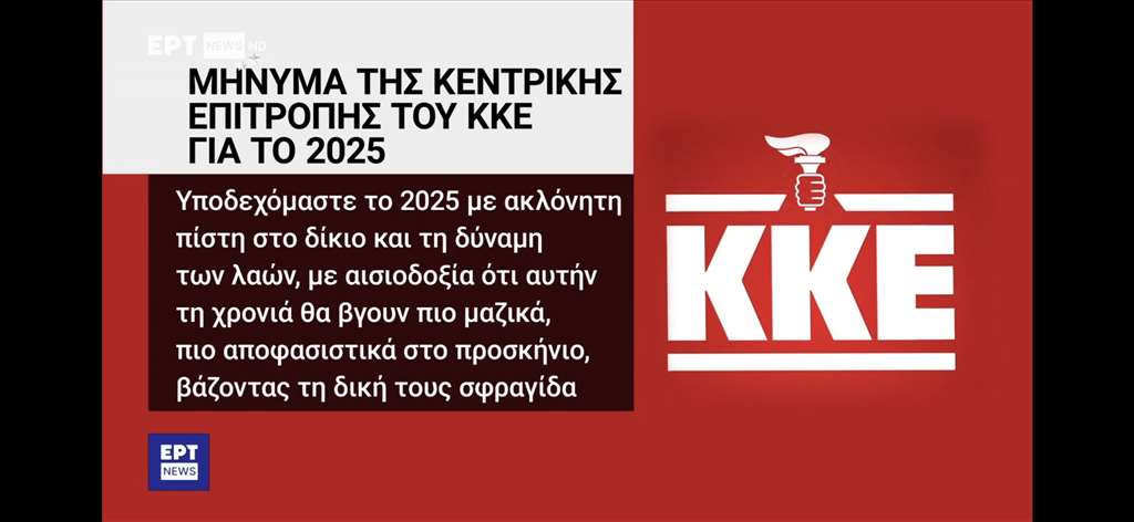 Ένα αδιανόητο, αλλά και ασυγχώρητο, περιστατικό σε βάρος του ΚΚΕ πραγματοποιήθηκε το απόγευμα της Πρωτοχρονιάς, όταν στο κεντρικό δελτίο ειδήσεων της ΕΡΤ στις 18.00, και στο ρεπορτάζ για τα μηνύματα των κομμάτων για τη νέα χρονιά προβλήθηκε το Μήνυμα της Κεντρικής Επιτροπής του Κόμματος για το 2025, συνοδευόμενο από παραποιημένο έμβλημα του ΚΚΕ.