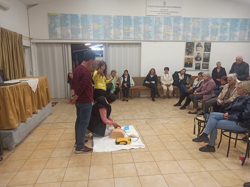 Η εκπαίδευση περιλάμβανε βασική υποστήριξη ζωής (BLS), αντιμετώπιση πνιγμονής και χρήση αυτόματου εξωτερικού απινιδωτή (AED), με στόχο την ενίσχυση της ετοιμότητας και της ασφάλειας των πολιτών σε κρίσιμες καταστάσεις.