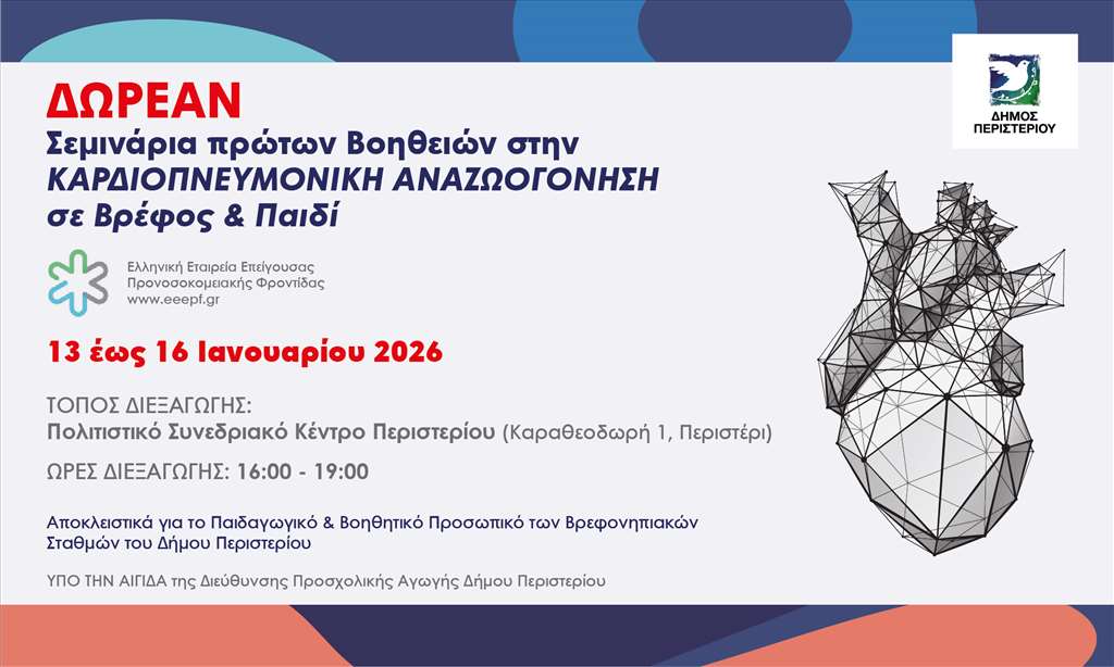Το σεμινάριο θα πραγματοποιηθεί από 13 έως και 16 Ιανουαρίου 2026, στην Αίθουσα Πολλαπλών Χρήσεων του Δημαρχιακού Μεγάρου Περιστερίου, από την