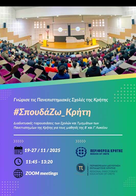 Η ενημέρωση των μαθητών όλων των λυκείων της Κρήτης για τις πολλαπλές και εξαιρετικές επιλογές σπουδών που προσφέρουν τα τρία πανεπιστημιακά ιδρύματα του νησιού, αποτελεί τον στόχο της δράσης με τίτλο «ΣπουδάΖω Κρήτη – Γνώρισε τις Πανεπιστημιακές Σχολές της Κρήτης», την οποία υλοποιεί η Περιφέρεια Κρήτης, σε συνεργασία με την Περιφερειακή Διεύθυνση Εκπαίδευσης Κρήτης.