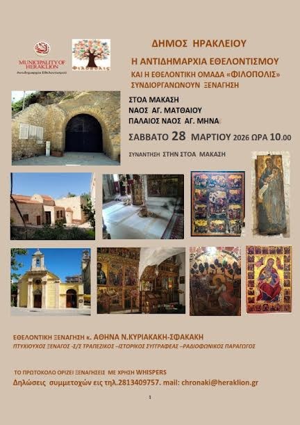Νέα ξενάγηση σε σημαντικά σημεία θρησκευτικού και ιστορικού ενδιαφέροντος της πόλης του Ηρακλείου θα πραγματοποιηθεί από την Αντιδημαρχία Εθελοντισμού του Δήμου Ηρακλείου σε συνεργασία με την Εθελοντική Ομάδα «Φιλόπολις» στο πλαίσιο των «Χαρτοδιαδρομών… στο Δήμο μας» το Σάββατο 28 Μαρτίου στις 10:00 με σημείο συνάντησης της Στοά Μακάσι.