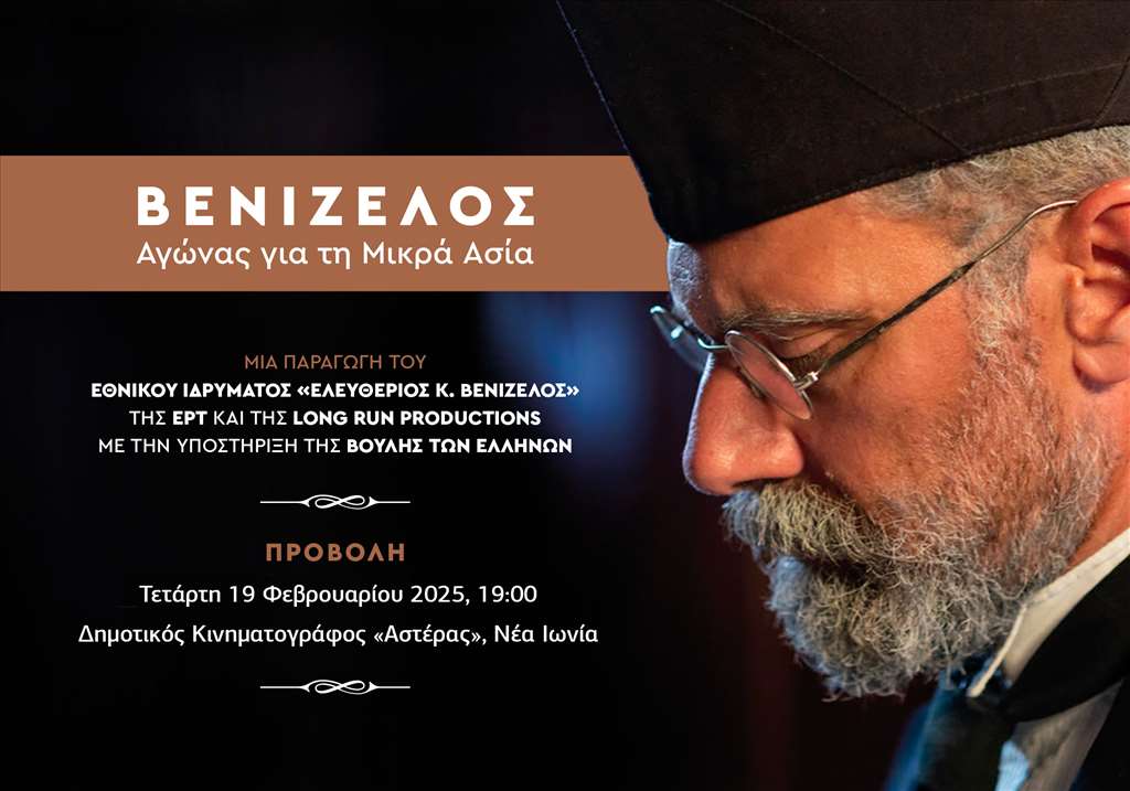 Την Τετάρτη 19 Φεβρουαρίου 2025 και ώρα 19:00 θα προβληθεί στον Δημοτικό Κινηματογράφο «Αστέρας» στην Νέα Ιωνία (Ασκληπιού 4) το ντοκιμαντέρ «Βενιζέλος, αγώνας για τη Μικρά Ασία», μία παραγωγή του Εθνικού Ιδρύματος «Ελευθέριος Κ. Βενιζέλος», της ΕΡΤ και της Long Run Productions.