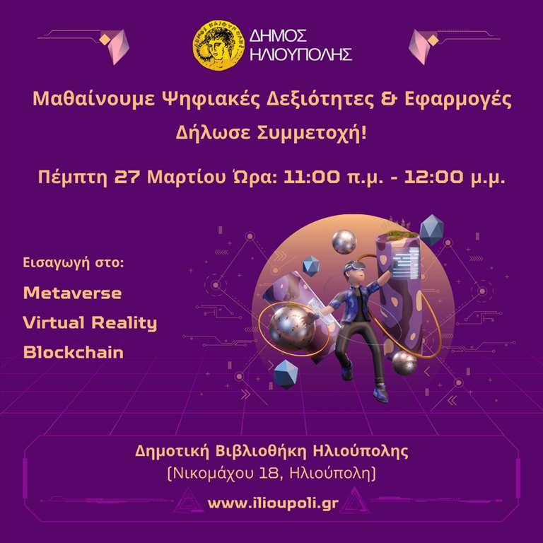 Συγκεκριμένα θα πραγματοποιηθεί στις εγκαταστάσεις του Media Lab της Δημοτικής Βιβλιοθήκης Ηλιούπολης συνάντηση με θέμα “Εισαγωγή στο Metaverse – Virtual Reality – Blockchain” την Πέμπτη 27 Μαρτίου 2025, 11:00π.μ.-12:00μ.μ.