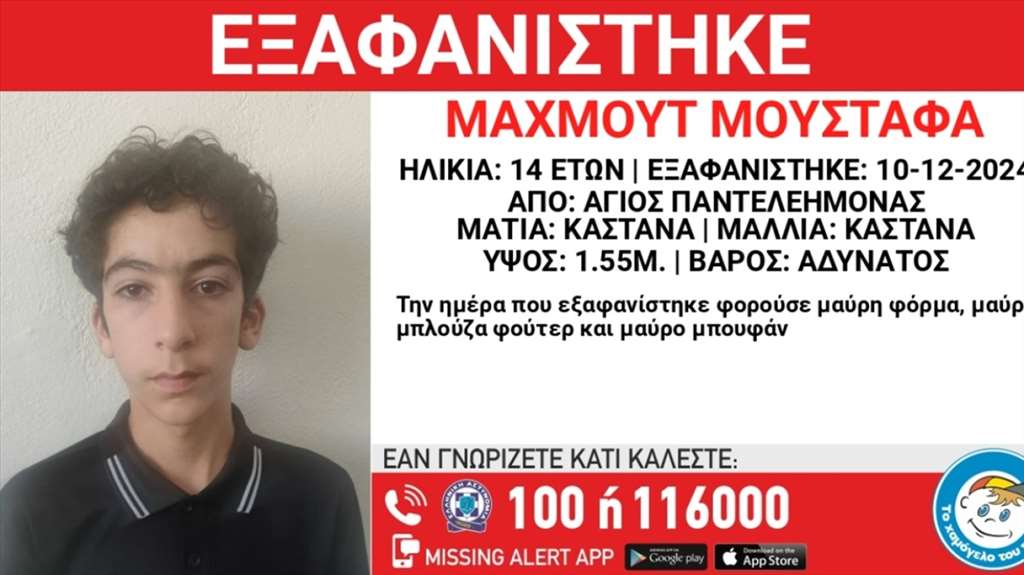 Συναγερμός έχει σημάνει στον Άγιο Παντελεήμονα, με την εξαφάνιση ενός 14χρονου από χώρο φιλοξενίας στην περιοχή. Συγκεκριμένα, ο 14χρονος Μαχμούτ (ον.) Μουσταφά (επ.), συριακής καταγωγής, εξαφανίστηκε στις 10/12/2024, βραδινές ώρες, από χώρο φιλοξενίας στον Άγιο Παντελεήμονα.