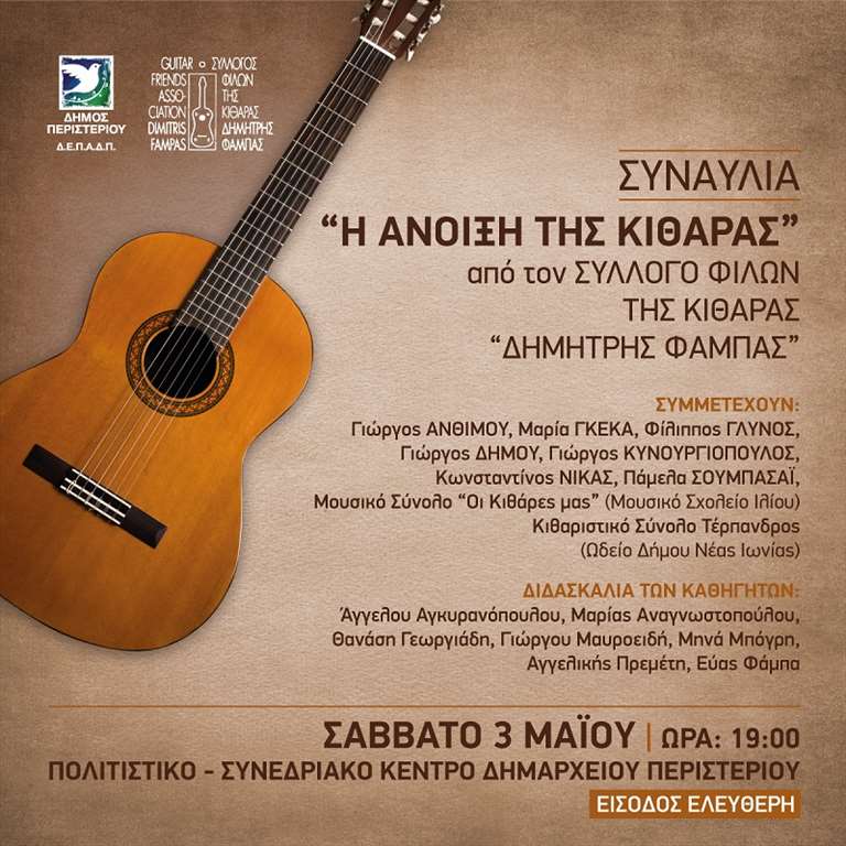 Ο Δήμαρχος Περιστερίου Ανδρέας Π. Παχατουρίδης σας προσκαλεί στη συναυλία με τίτλο «Η Άνοιξη της Κιθάρας» του Συλλόγου Φίλων της Κιθάρας «Δημήτρης Φάμπας», μια εκδήλωση υψηλής αισθητικής αφιερωμένη στην κιθαριστική μουσική.